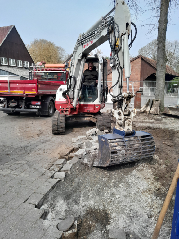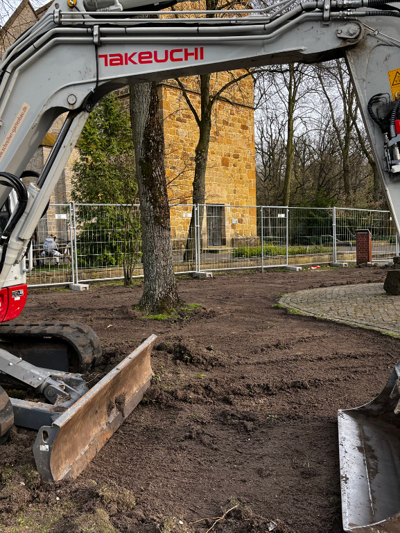 Seit Montag, 23.03. ist Bewegung auf dem Kirchplatz: Die Bauarbeiten haben offiziell begonnen. Ein Bagger hat zunächst alte Pflasterflächen aufgenommen und Rasen abgeschält. Einige Passanten blieben stehen und verfolgten die Arbeiten mit großer Neugier. In den nächsten Tagen wird der Untergrund vorbereitet.